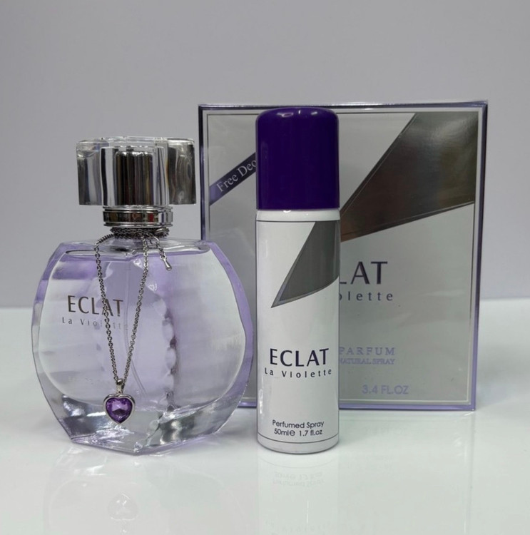 ادکلن فراگرنس ورد اکلت لا ویولت رایحه لانویت اکلت محصول سال 2016 برند اماراتی شناخته شده فراگرنس ورد است. عطر ادکلن اکلت با ساختار مرکبات و رایحه ای خنک و شیرین برای روزهای بهاری و تابستانی مناسب می باشد. عطر زنانه ECLAT La Violette به دور شیشه ی خود گردنبندی دارد که در نگاه اول توجه بیننده را به خود جلب می کند. این گردنبند با نگینی به شکل قلب هدیه ای برای طرفداران و خریداران این ادو پرفیوم زنانه می باشد.